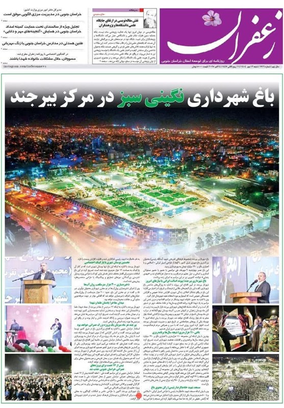 روزنامه زعفران: باغ شهرداری سبز Negini در مرکز Birjand ، Khorasan یک الگوی موفق در مدیریت مرز است ، مقامات حلال مشکلات شهدا هستند ، توطئه جدیدی علیه غزه شکل می گیرد ، همدلی در مدارس خراسان جنوبی.
