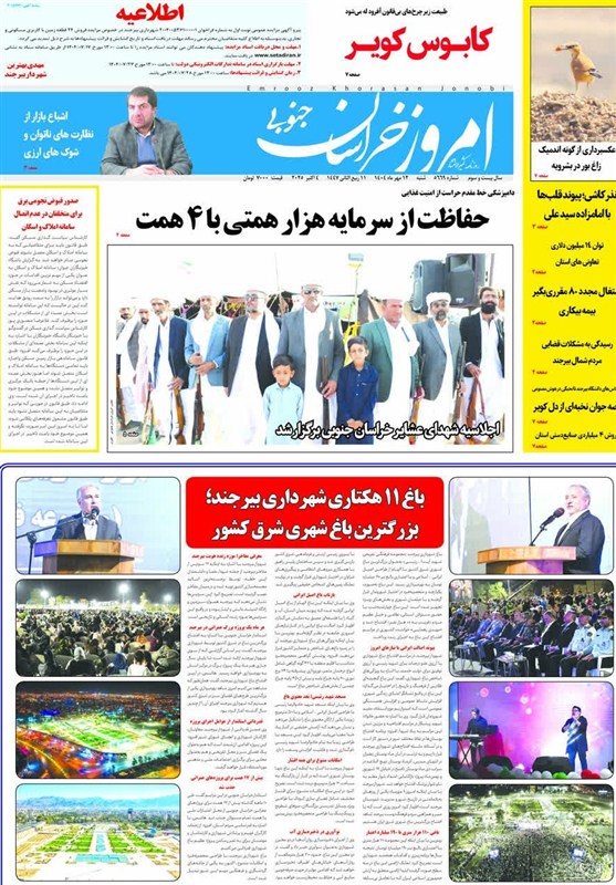 روزنامه جنوبی خراسان: نخبگان استانی ، رشد و رشد Khorasan جنوبی ، Khorasan جنوبی با مصرف نمک زیاد و عدم تحرک در خط مقدم بیماری قلبی ، Khorasan South گوشت مرغ را در استان های دیگر تأمین می کند ، مصوبات مسافرتی در سراسر کشور دنبال می شود و ۹۷ ٪ از خواسته های گندم استانی را پرداخت می کند ، نرخ شهادت در قبیله.