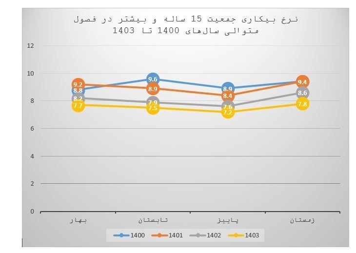 نرخ بیکاری یکی از مهمترین شاخص های اقتصاد هر کشور است. این شاخص یکی از شاخص های اصلی در ارزیابی وضعیت اقتصادی و اجتماعی هر کشور است. تجزیه و تحلیل نرخ بیکاری می تواند به صورت فصلی و سالانه انجام شود. از آنجا که این نشان دهنده روندهای موجود در بازار کار و توانایی سیستم اقتصادی در ایجاد فرصت های شغلی پایدار است. در سالهای اخیر ، اقتصاد ایران بر چالش های مختلفی غلبه کرده است. چالش هایی که هر یک به نوعی بر نرخ اشتغال و بیکاری تأثیر گذاشته اند. بررسی روند تغییرات ایجاد شده در فواصل فصلی و سالانه می تواند تصویری دقیق تر از عملکرد عملکرد بازار کار ، تأثیر سیاست های اقتصادی و وضعیت گروه های مختلف جمعیتی از جمله جوانان و زنان ارائه دهد. این گزارش به دنبال تجزیه و تحلیل و ارزیابی این نرخ ها در سالهای اخیر است و به دنبال درک عمیق تر از وضعیت اشتغال و بیکاری در کشور است.